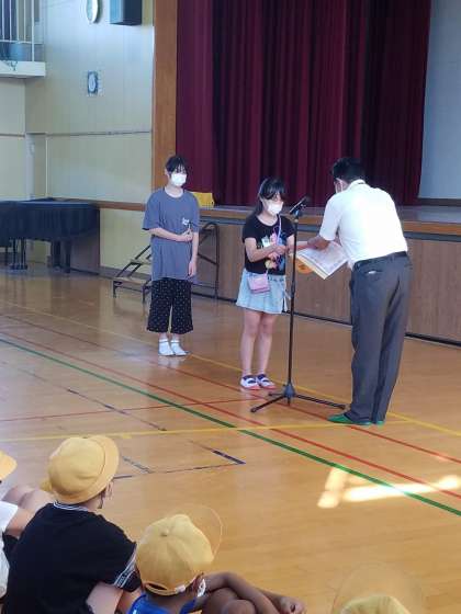 朝の挨拶のあとには、1年生から6年生の代表が、平和や友だちについて考えて書いた作文を発表しました。学習を通して、平和を大切にしようとしたり、友だちを思いやろうとしたりする気持ちや態度が育っています。代表児童には、表彰状が渡されました。