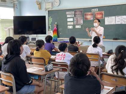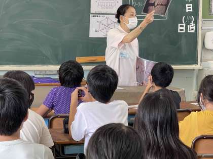 学校医の歯科医の先生と、歯科衛生士の方による、歯と口の健康教室です。歯の健康を保つために、普段の生活が大切であることを教えていただきました。中でも生活習慣と歯磨きの大切さについて、具体の絵や写真、画像等で学習しました。