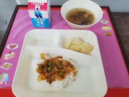 牛乳、タコライス、もずくのスープ、焼きじゃが