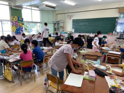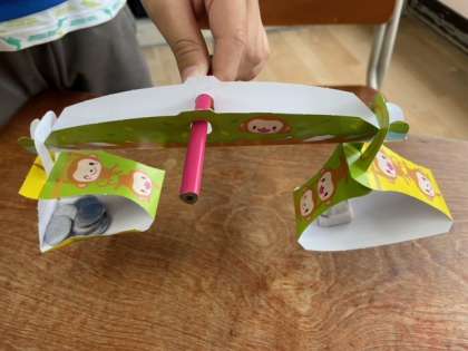 算数の時間に1円玉を使って、重さを調べました。1円玉1枚は1グラムです。