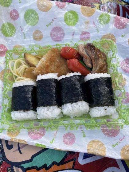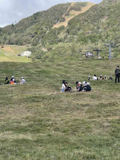 宿舎で用意していただいたお弁当を高原で食べています。雨が降らなければ、高丸山まで登山する予定です。
