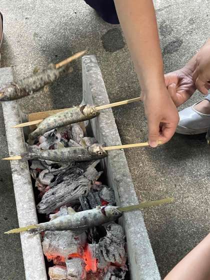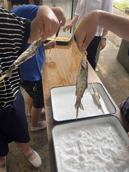つかまえたさかなを洗って、塩をつけて、串を打って炭火で焼きます。自分でつかまえたさかなは美味しいです。