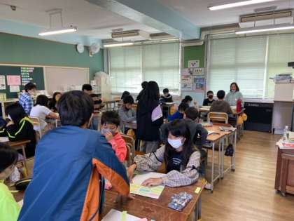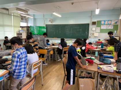 まず、自画像を描き、班の友だちのいいところを5個みつけ、付箋に書きました。