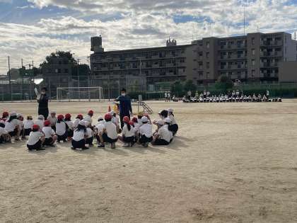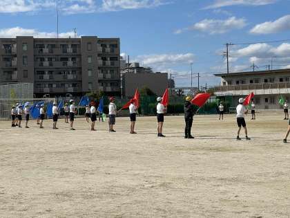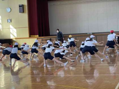 午後からは、5年生6年生で中学校の運動場を有効に使いつつ、小学校の講堂と並行して運動会の練習をしました。実際のスケールを中学校の運動場で確認しながら進めています。