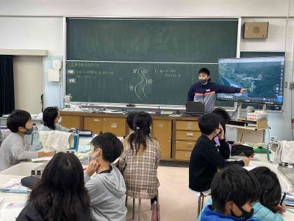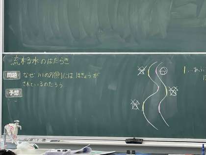 川の流れをもとに、曲がっているところには、どのような特ちょうがあるか考える学習をしています。流れる水には、地面を削ったり、土を運んだり、積もらせたりする働きがあることを理解しています。
