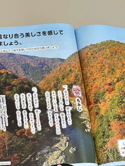 4年生の教材、「もみじ」の学習です。教科書にある絵や歌唱の曲をきいて、思い浮かんだ曲のイメージや情景について話し合いながら、曲について詳しく学習しています。