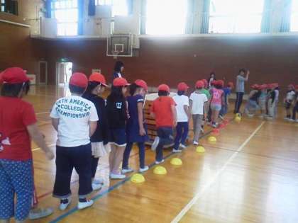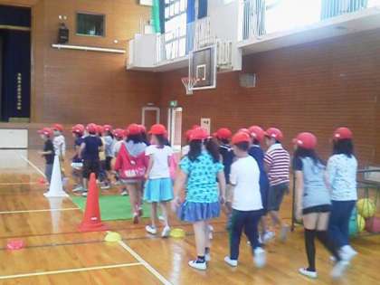 3年生がトップバッターです。先生が講堂に、歩道や横断歩道をセットし、道路に置いてある障がい物もイメージして、細くなっているところの歩き方や列の並び方を学習しました。