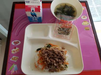 牛乳、ビビンバ、わかめスープ、アーモンドフィッシュ