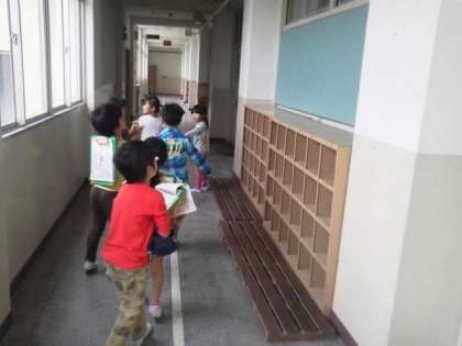 今日は2年生が1年生を案内して学校探検をしました。案内をするグループと、ポイントにいてクイズを出すグループにわかれて、活動しました。自分たちで考えたクイズは、なかなか楽しい問題になっていました。