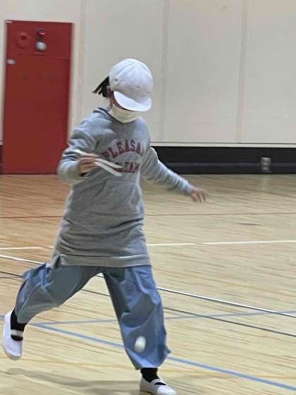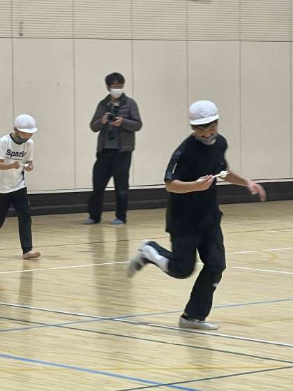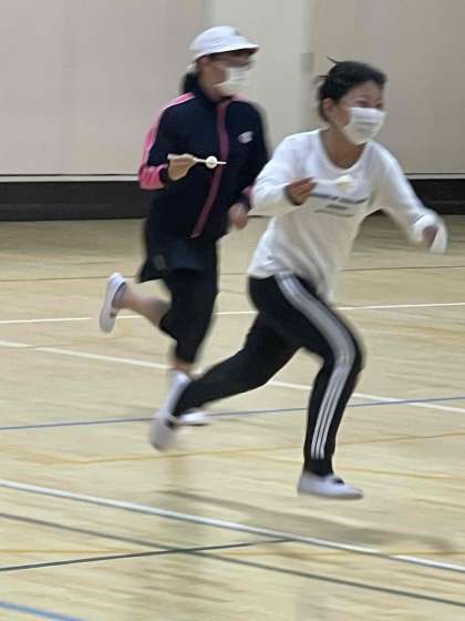 室内オリンピック最終競技、割り箸ピンポン球リレーです