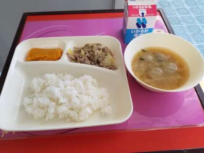 ごはん、牛乳、豚肉とまいたけのいためもの