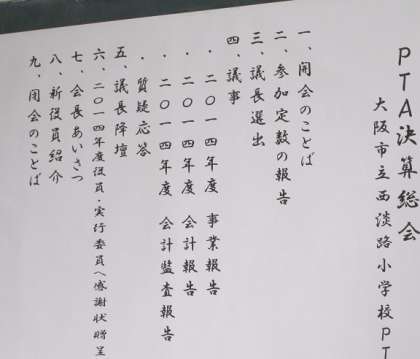 学習参観・懇談会の後、大会議室にて昨年度の決算総会と、今年度の予算総会を行いました。今年度の新体制が発足しました。