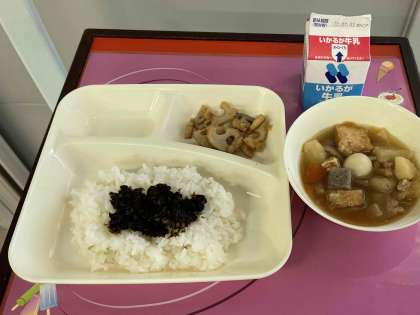 ごはん、牛乳、関東煮、れんこんの梅風味焼き、のりのつくだ煮です。