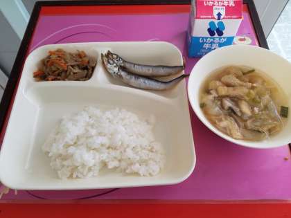 ごはん、牛乳、、焼きししゃも、五目汁、きんぴらごぼう