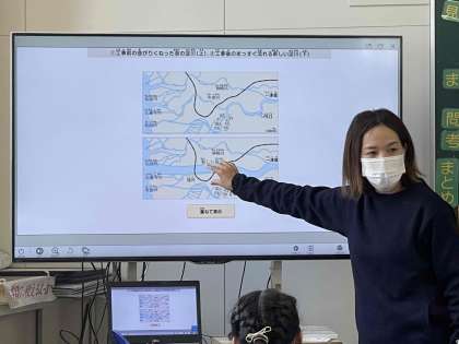 淀川について、今と昔のちがいについて考えています。図などをもとにどう変わったかを意識しながら、作り変えてきた人々の苦労を学習していきます。
