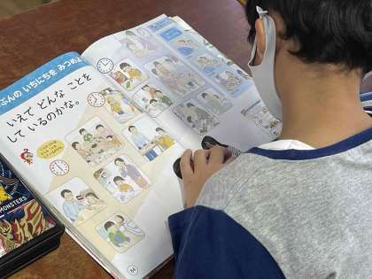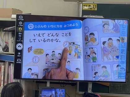 生活科の学習で、絵をみて自分の一日を振り返っています。絵にある時計をみながら自分の生活の振り返りをしています。