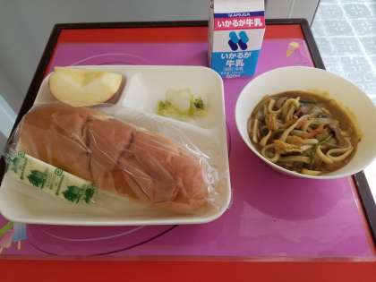 パン、牛乳、カレーうどん、はくさいの甘酢あえ、りんご