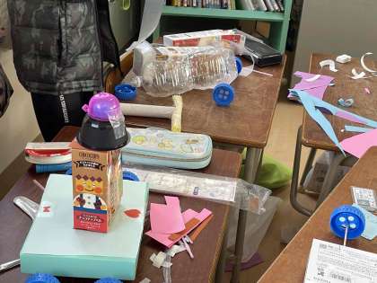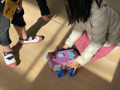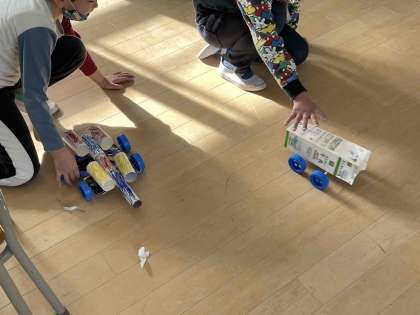 車輪をとりつけて、動くおもちゃづくりをしています。車体や車輪のおもさや長さを調節して、動かしながら工夫しています。