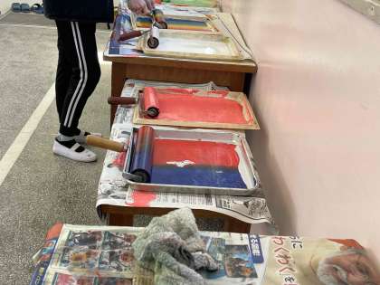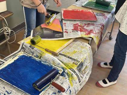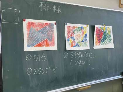 5年生では、作品展に向けた作品づくりとして、スチレン版を使った版画をしています。色づかいに気をつけて作品を仕上げています。