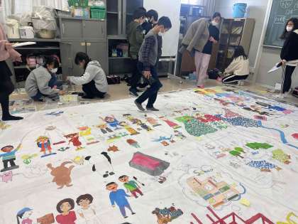 SDGsの学習を通じて学んだことをゲルニカとして、協働作品を制作しています。それぞれのメッセージや願い、思いを盛り込みつくっています。