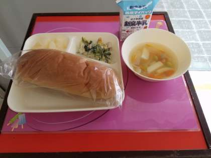 パン、牛乳、マカロニグラタン、ウインナーのスープ、和なし(カット缶)