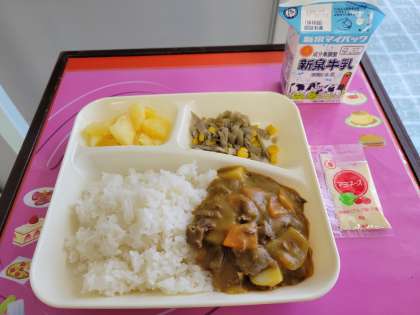 牛乳、牛肉と金時豆のカレーライス、ごぼうサラダ