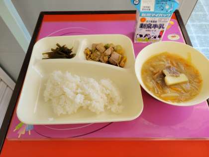 ごはん、牛乳、まぐろの甘辛焼き、豚汁、くきわかめのつくだ煮