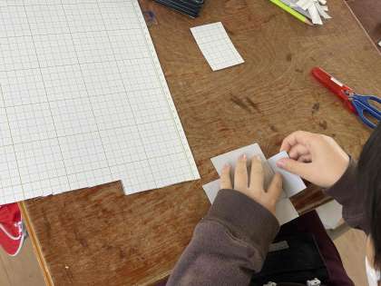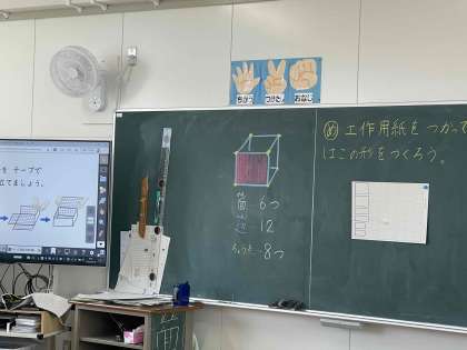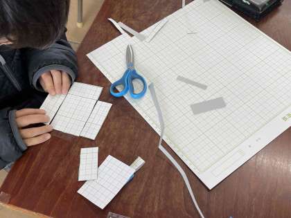 工作用紙をつかって、面・辺・ちょう点に気をつけて、実際に工作用紙を切り取って貼り合わせ、図形から立体のしくみを学習しています。
