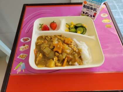 牛乳、チキンレバーカレーライス、きゅうりとコーンのサラダ、いちご