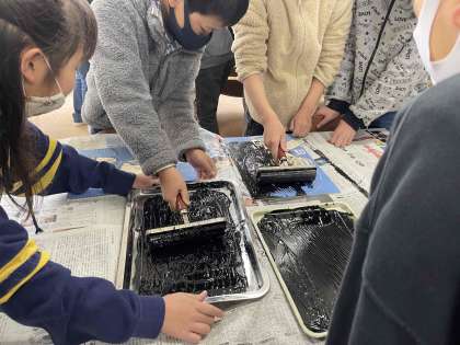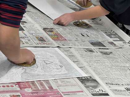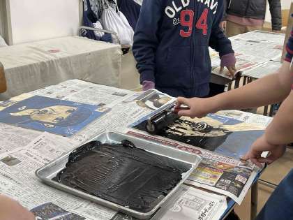 これまで、彫り進めた版画板をいよいよ刷ります。インクをていねいに均等に延ばして、友達と協力して紙をそっと置きます。バレんで円を描きながら紙に写して、またそっと紙をはがして乾かします。
