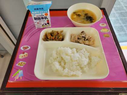 ごはん、牛乳、鶏肉のしょうゆマヨネーズ焼き、みそ汁、きんぴらごぼう