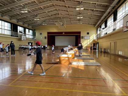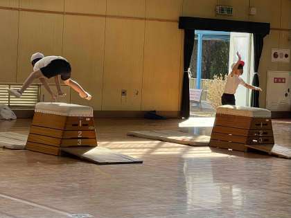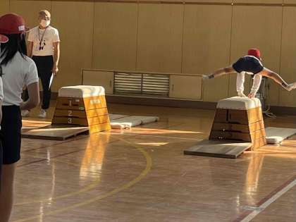 とび箱を練習しています。開脚跳びでは、踏み切り、着手、着地の意一連の動がスムーズにできるように、練習しています。