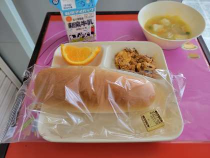 パン、牛乳、とうふのミートグラタン、押麦と野菜のスープ煮
