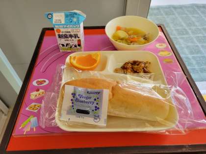 パン、牛乳、鶏肉のみそバターソース、洋風煮、デコポン