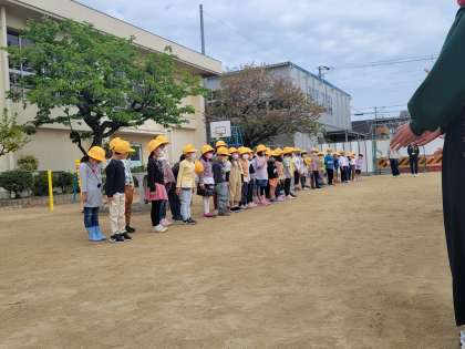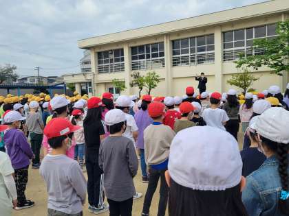 4月7日に入学した1年生と、2年生〜6年生のみんなが初めて出会う、「対面式」を運動場で行いまいした。「よろしくお願いします。」のあいさつをしました。