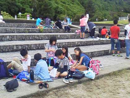 雨が降っていないので、予定通り、海洋センターとなりの砂浜に移動し、お昼ご飯を食べています。保護者の皆さん、ご準備ありがとうございました。