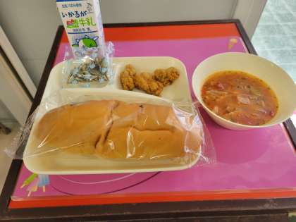 パン、牛乳、一口トンカツ、ミネストローネ、ミニフィッシュ