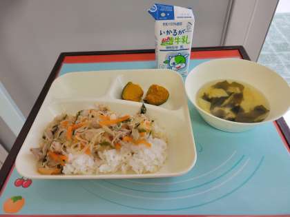 ごはん、牛乳、豚丼、湯葉のすまし汁、かぼちゃのしょうゆ焼き