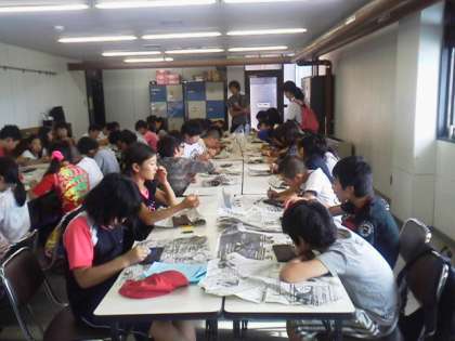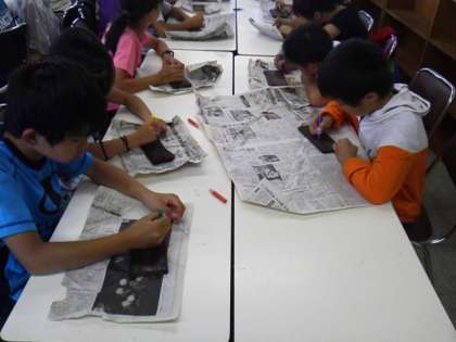 いかだの後は、朝磨いておいた「焼板」に文字や絵をかいて、かっこよく仕上げていきます。どんな作品に仕上がったのかな?