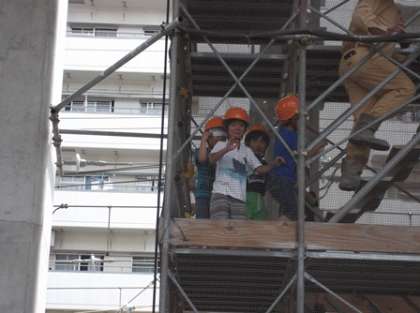 そのあと、現場へ行き、ヘルメットをかぶって見学です。工事現場用の階段を上がって、駅ができる高さに上がり、説明を聞きました。