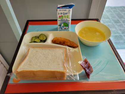 パン、牛乳、サーモンフライ、豆乳スープ、