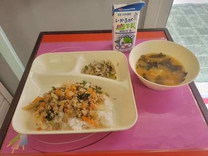 牛乳、豚ひき肉とにらのそぼろ丼、みそ汁、キャベツの赤じそあえ