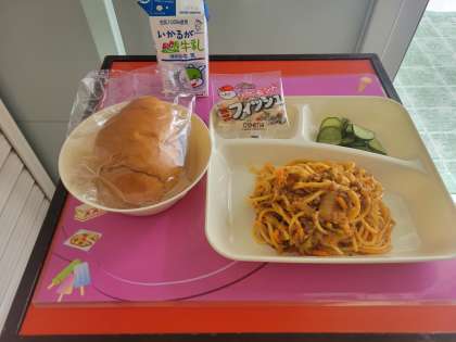 パン、牛乳、スパゲッティミートソース、きゅうりのピクルス