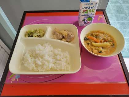 ごはん、牛乳、鶏肉のおろしじょうゆかけ、みそ汁、野菜いため