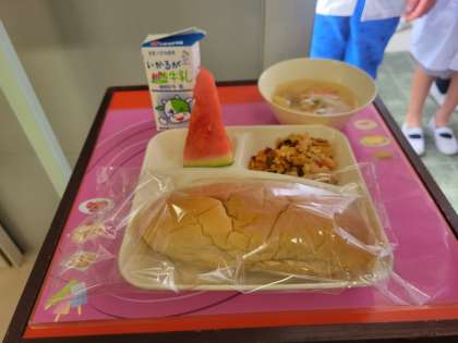 パン、牛乳、パエリア、ウインナーとキャベツのスープ