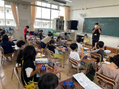 ゴムの力のはたらきを調べるために、模型を使って調べます。そのための組み立てをしています。