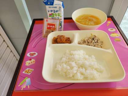 ごはん、牛乳、豚肉ともやしのいためもの、すまし汁、