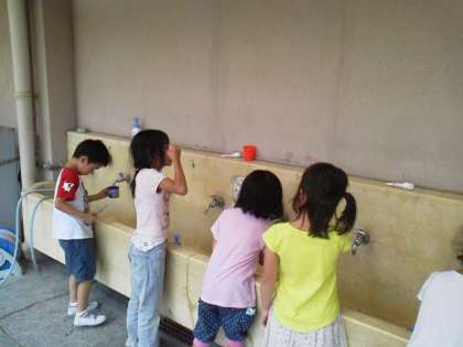 給食終了後、手洗い場で「シュコシュコ シュッシュ」「ぶくぶく ペッ」とみんなで歯磨き。きれいに磨けたかな。虫歯になると元には戻りません。毎日、しっかり磨く習慣をつけましょう。