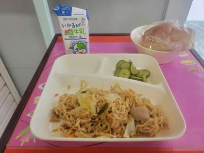 パン、牛乳、オイスターソース焼きそば、きゅうりの甘辛あえ