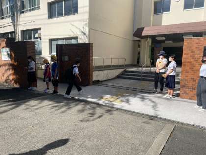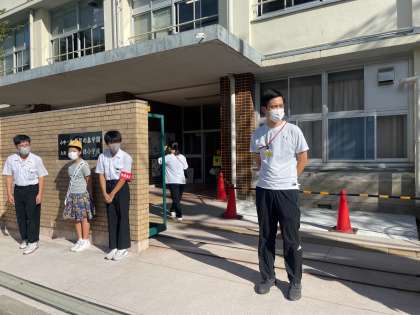 本日より、須賀の森学園西淡路小学校児童会と淡路中学校生徒会の合同あいさつ運動が始まりました。まだまだ朝から気温も高く暑い中ですが、元気な声が返ってきます。